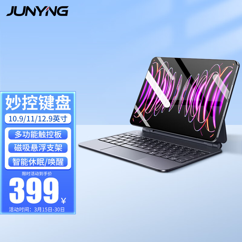 君盈(junying)妙控键盘是一款专为iPad Pro 11/10.9英寸和Air4/5苹果平板设计的智能触控蓝牙套装。这款保护套采用了磁吸悬浮和多点触控板技术,使得用户可以更加方便地使用iPad,同时也能够有效地保护设备。