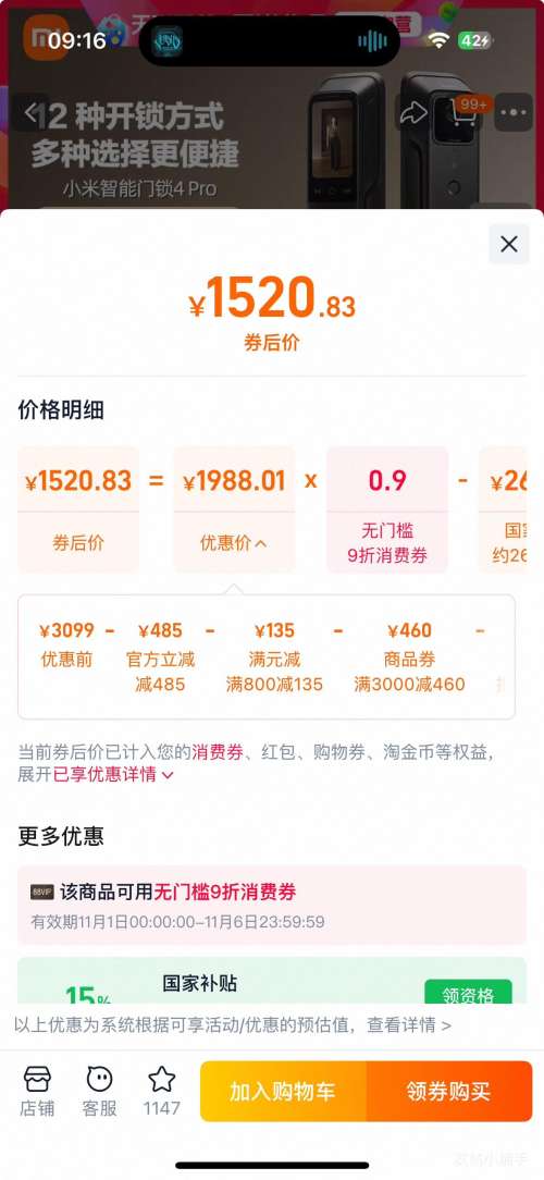 商品到手价1520.83元+3099淘金币(需领券),根据小编提供的优惠信息(优惠券+满3000减360+88vip双11无门槛9折 开门红消费券 至高抵(150/500)+如何使用淘金币抵扣+家装家纺-政府补贴15%/20%--部分地区可领+慢津贴3.42元),下单1件。好价不错过,感兴趣的朋友可以试试!