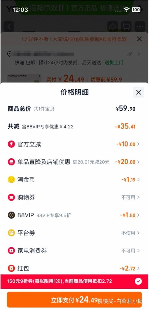 商品到手价23.3元包邮+119淘金币(需领券),根据小编提供的优惠信息(优惠券+满20.01减20+88vip双11无门槛9折 开门红消费券 至高抵(150/500)),下单1件。好价不错过,感兴趣的朋友可以试试!
