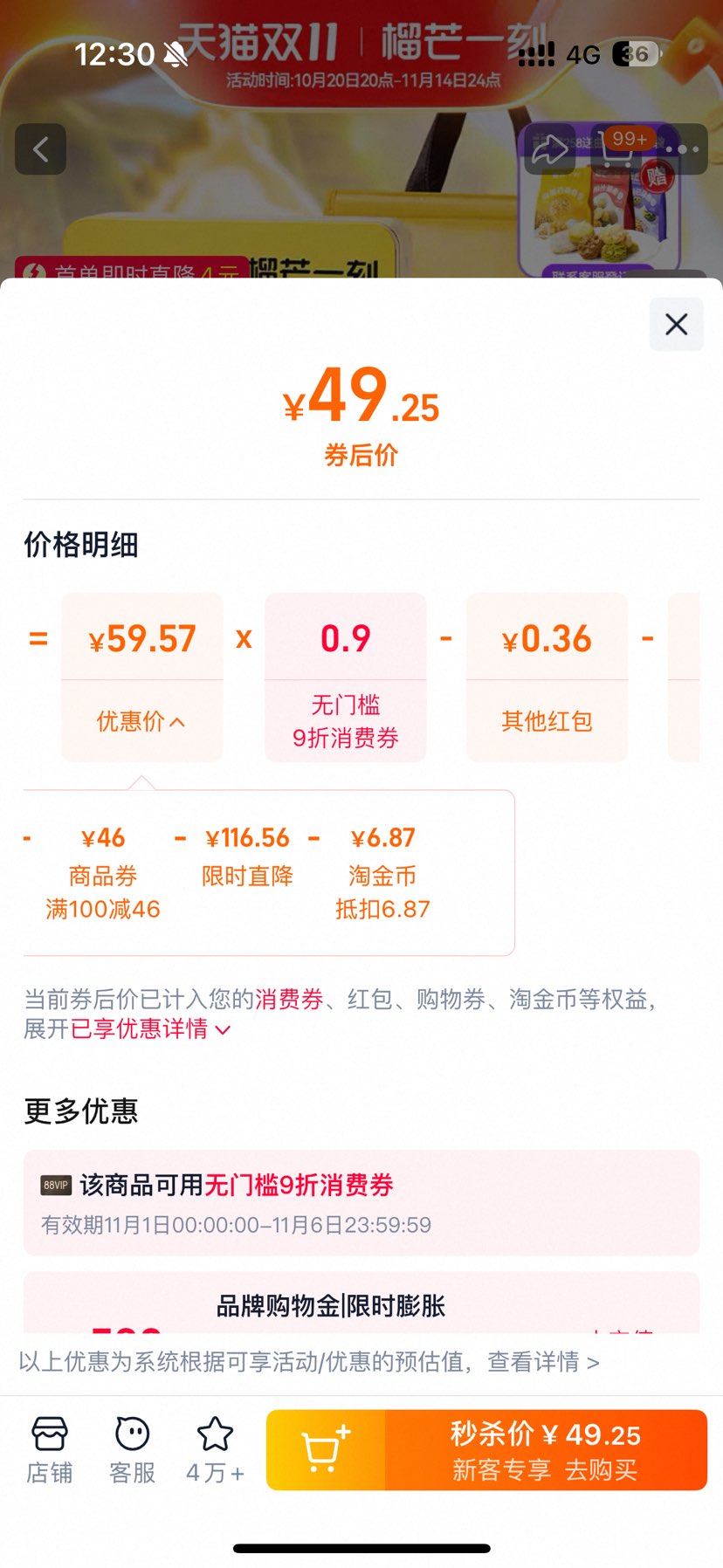 商品到手价49.61元(需领券)+6.87元淘金币,根据小编提供的优惠信息(满100减46+88vip双11无门槛9折 开门红消费券 至高抵(150/500)+慢津贴1元),下单1件。好价不错过,感兴趣的朋友可以试试!