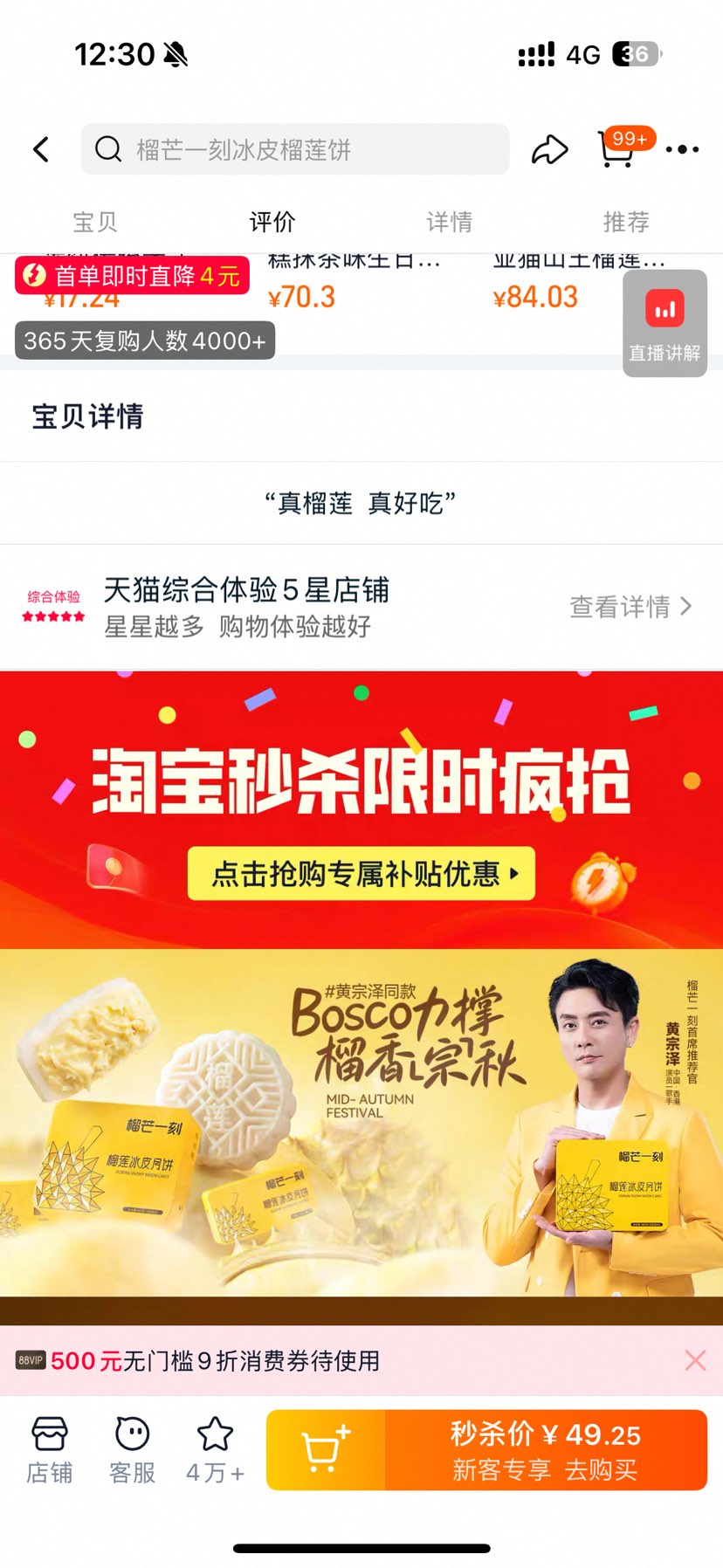 天猫旗舰店闭眼买、再降价、榴芒一刻榴莲冰皮月饼100g×6