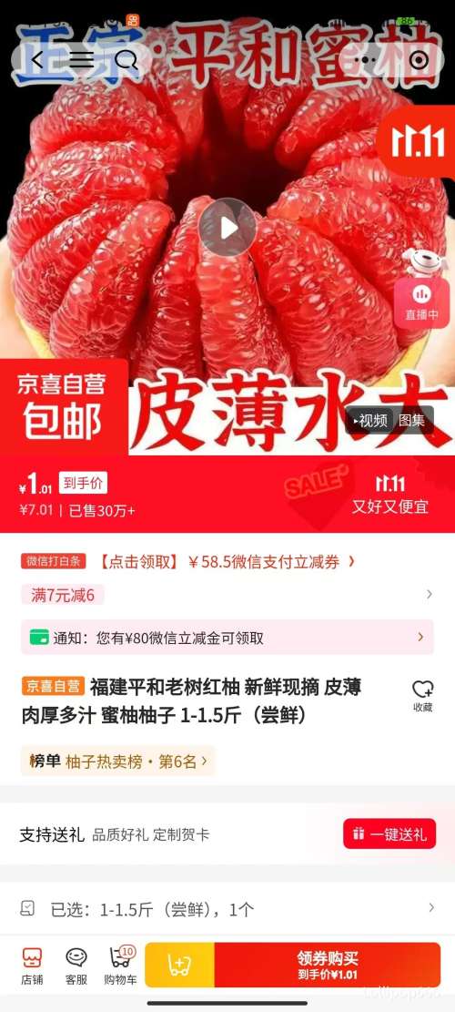 京东商城闭眼买:京喜 福建平和老树红柚 蜜柚柚子 1-1.5斤(尝鲜)