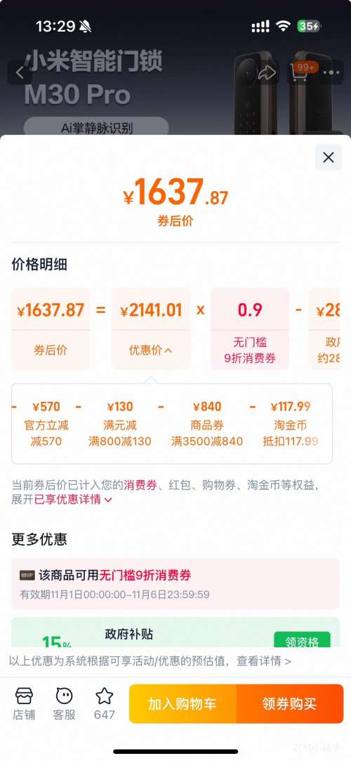 商品到手价1637.87元+11799淘金币(需领券),根据小编提供的优惠信息(优惠券+满3000减360+88vip双11无门槛9折 开门红消费券 至高抵(150/500)+家装家纺-政府补贴15%/20%--部分地区可领+百亿补贴金刚券-9折/8折+如何使用淘金币抵扣),下单1件。好价不错过,感兴趣的朋友可以试试!