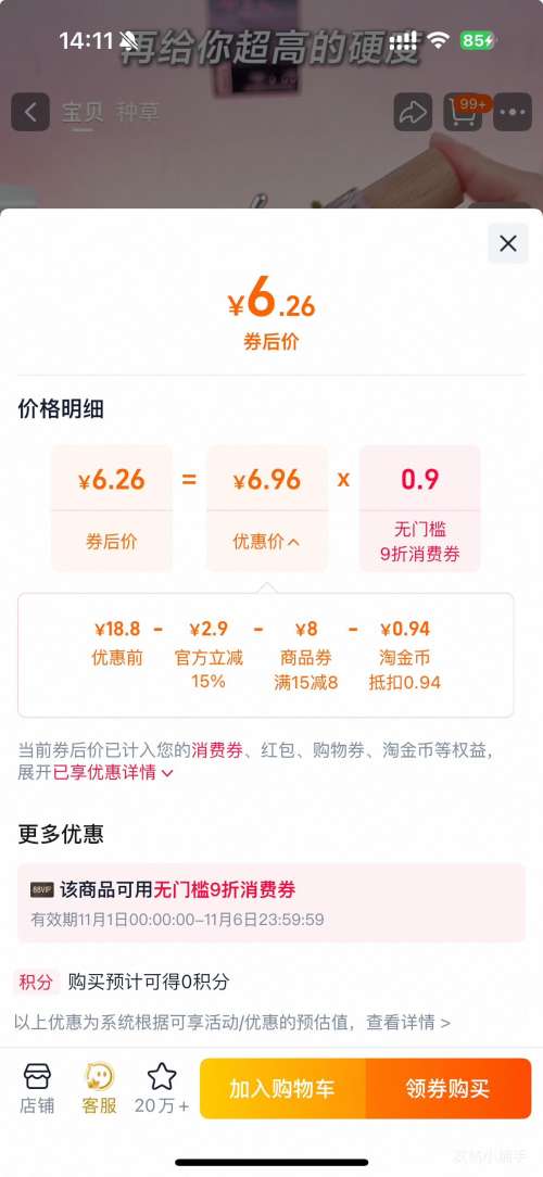 商品到手价6.26元(需领券),根据小编提供的优惠信息(优惠券+满15减8+88vip双11无门槛9折 开门红消费券 至高抵(150/500)+如何使用淘金币抵扣),下单1件。好价不错过,感兴趣的朋友可以试试!