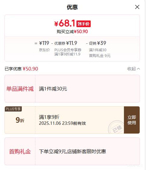 商品到手价68.1元,根据小编提供的优惠信息(plus超级补贴 限时加码9折券 至高抵(150/500 )),下单1件。好价不错过,感兴趣的朋友可以试试!