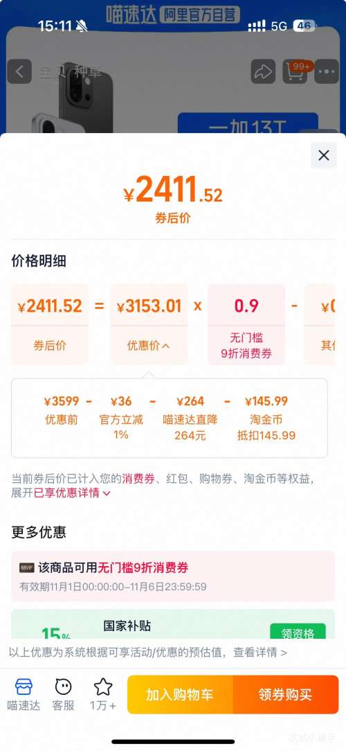 商品到手价2412.05元+14599淘金币,根据小编提供的优惠信息(优惠券+88vip双11无门槛9折 开门红消费券 至高抵(150/500)+手机&平板&电脑&穿戴-政府补贴15%/20%-部分地区可领+如何使用淘金币抵扣),下单1件。好价不错过,感兴趣的朋友可以试试!