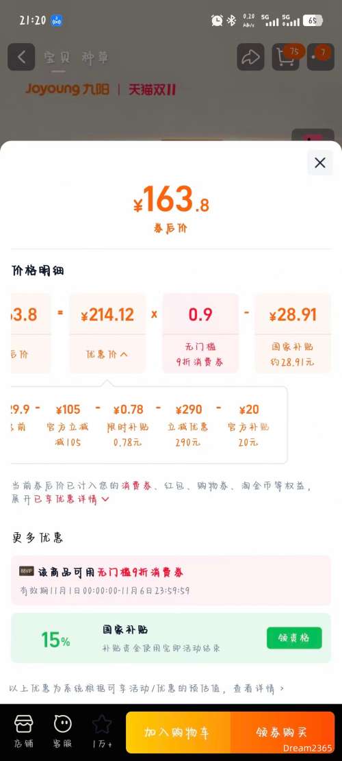 商品到手价163.80元,根据小编提供的优惠信息(优惠券+88vip双11无门槛9折 开门红消费券 至高抵(150/500)+家电-政府补贴15%/20%--部分地区可领+如何使用淘金币抵扣),下单1件。好价不错过,感兴趣的朋友可以试试!