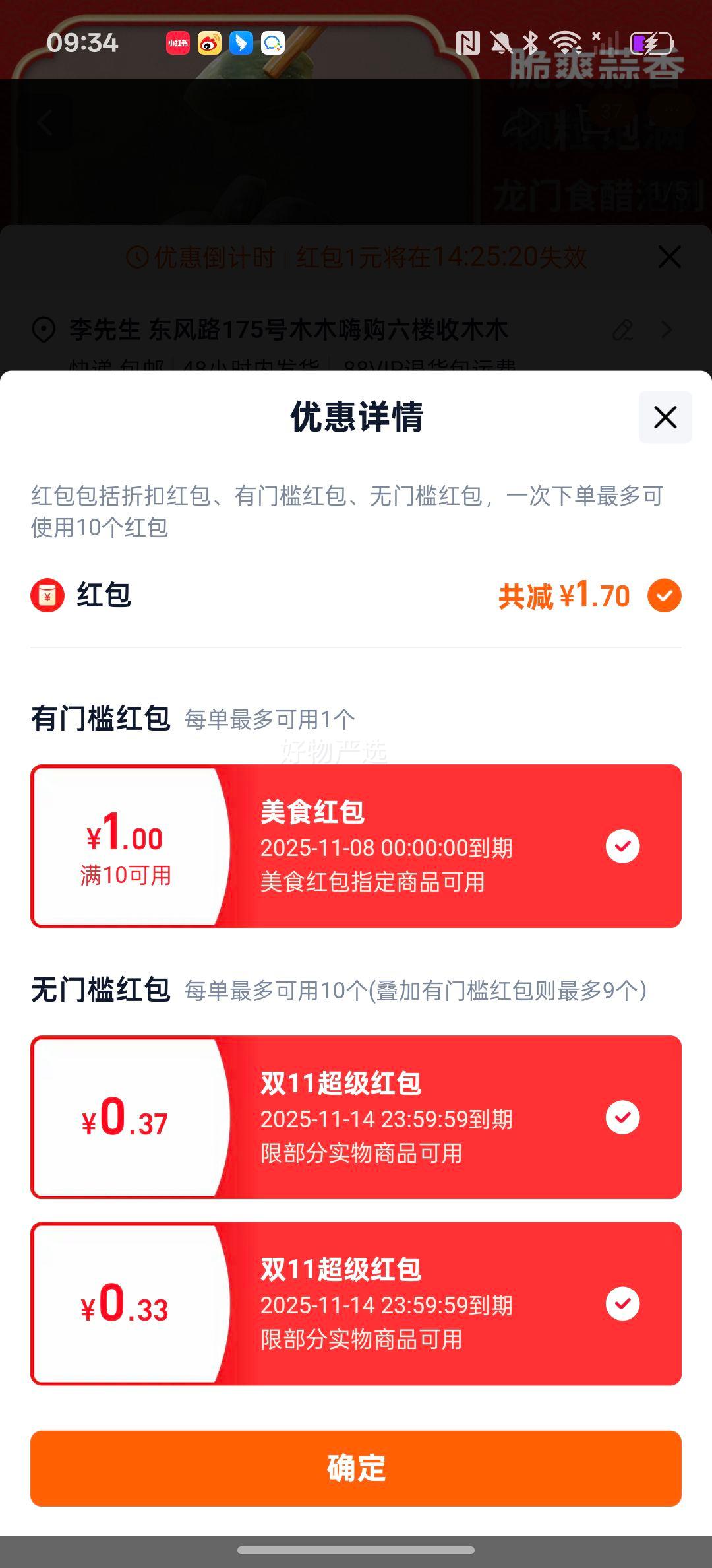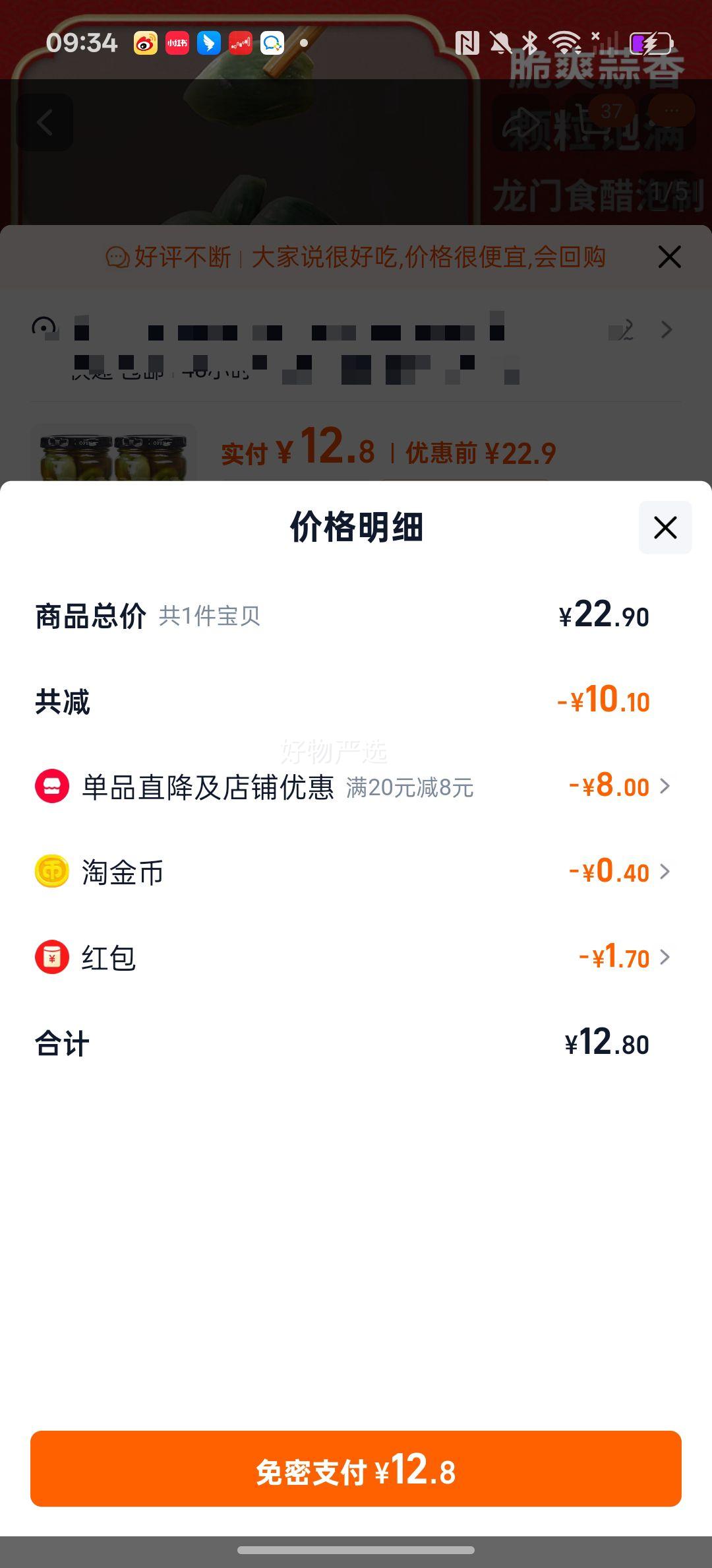 商品到手价淘金币抵扣0.4元,美食红包1元,双十一超级红包一共抵扣0.7元,到手12.8元。,根据小编提供的优惠信息(满20减8),下单1件。好价不错过,感兴趣的朋友可以试试!