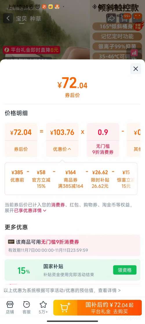 商品到手价72.67元(需领券),根据小编提供的优惠信息(优惠券+满297减93+88vip双11无门槛9折 开门红消费券 至高抵(150/500)+家电-政府补贴15%/20%--部分地区可领+慢津贴1.13元+385-164),下单1件。好价不错过,感兴趣的朋友可以试试!