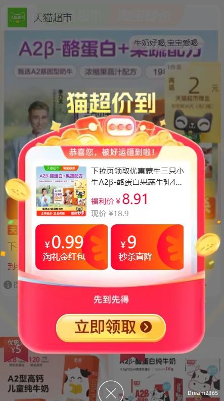 天猫超市天降礼金:三只小牛 A2β-酪蛋白儿童果蔬牛乳 125ml*4盒