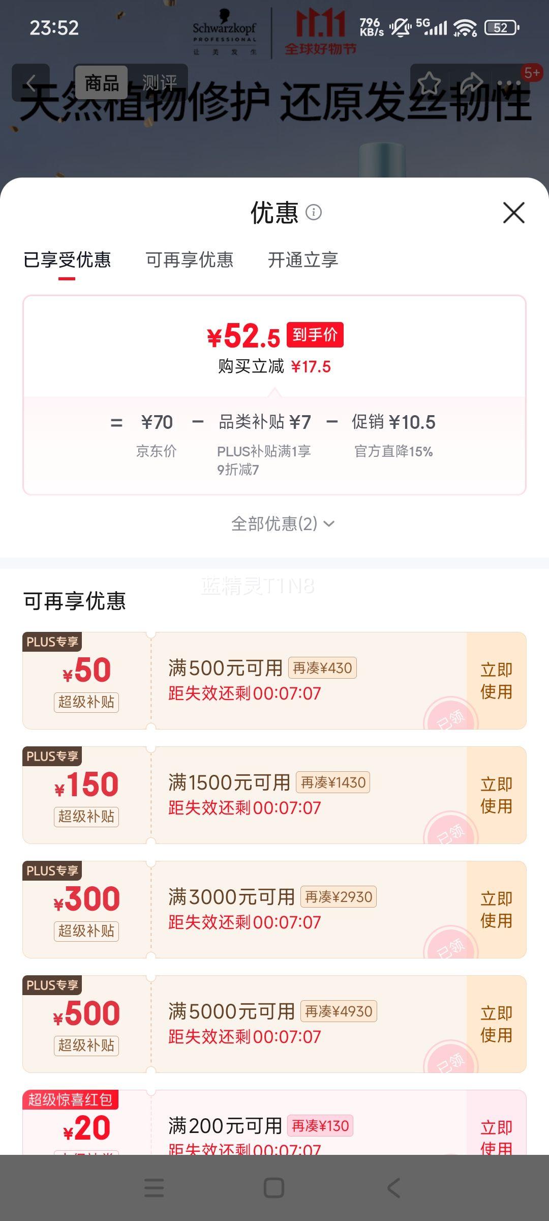 商品到手价52.5元(需领券),根据小编提供的优惠信息(plus超级补贴 限时加码9折券 至高抵(150/500 )),下单1件。好价不错过,感兴趣的朋友可以试试!