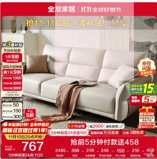 京东自营20点、再降价、PLUS:全友家居 家用客厅沙发小户型现代简约实木框架直排式一字科技布沙发
