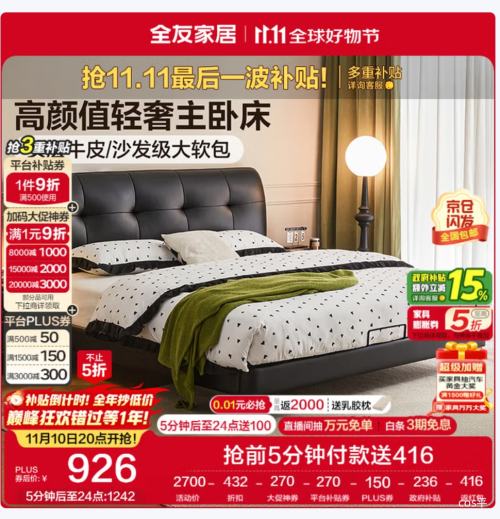 京东自营20点、PLUS:全友家居意式简约风头层牛皮床头软包靠背卧室1.8米×2米真皮双人大床