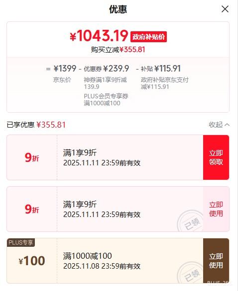 商品到手价1043.19元(需领券),根据小编提供的优惠信息(满1元,打9折+plus 限时加码好券 手机/家具/时尚/母婴专享补贴(1000-100/200-20/2000-200/200-20/2000-120/499-50)+3C-政府补贴15%/20%--部分地区可领),下单1件。好价不错过,感兴趣的朋友可以试试!