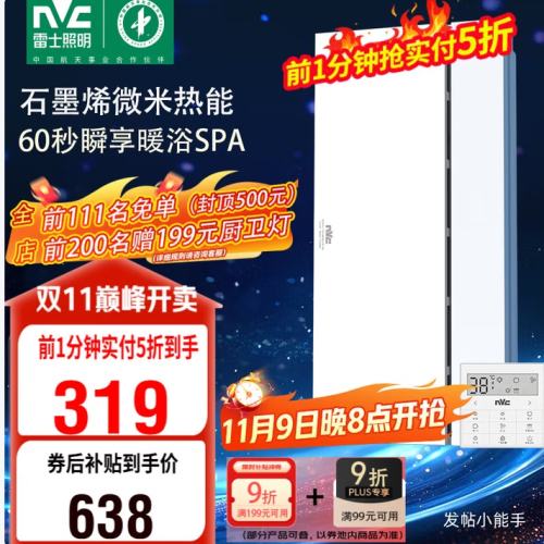 京东自营20点、再降价:雷士(NVC)政府补贴石墨烯变频智能浴霸照明暖风换气排风一体浴室卫生间Y407