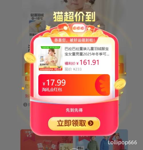 天猫超市天降礼金、88VIP:巴拉巴拉 儿童保暖羽绒服外套