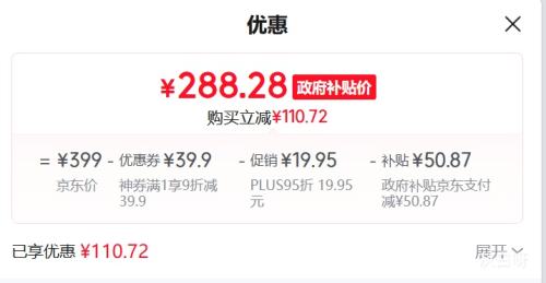 商品到手价258.28元(需领券),根据小编提供的优惠信息(满1元,打9折+家电-政府补贴15%/20%-部分地区可领),下单1件。好价不错过,感兴趣的朋友可以试试!