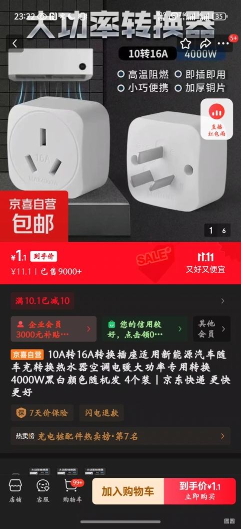 10A转16A转换插座 适用新能源汽车 4000W黑白颜色随机发 4个装