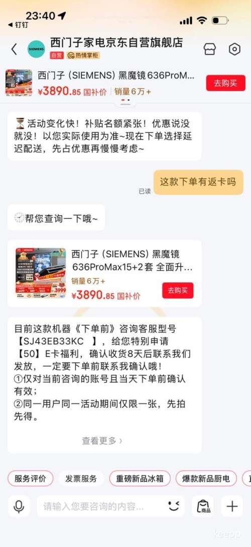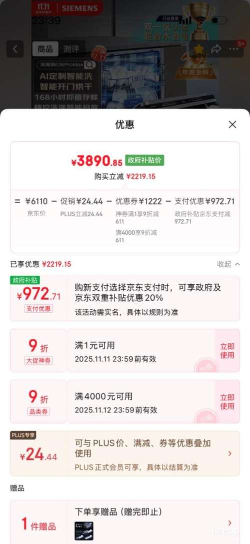 商品到手价3718.65元包邮(需凑单,咨询客服下单后返50元E卡),根据小编提供的优惠信息(满4000元,打9折+凑单品+家电-政府补贴15%/20%-部分地区可领),下单1件。好价不错过,感兴趣的朋友可以试试!