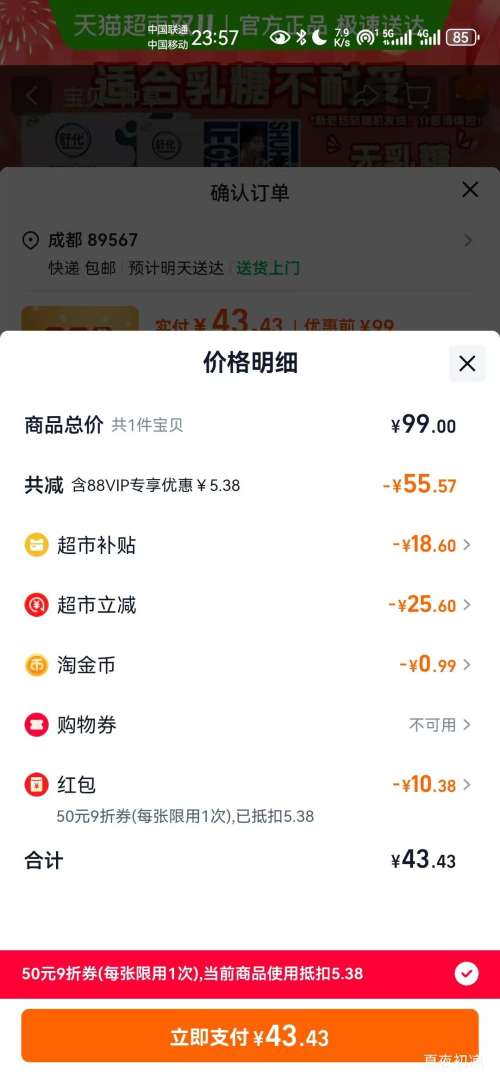 商品到手价40.5元+99淘金币,根据小编提供的优惠信息(优惠券+88vip双11无门槛9折 开门红消费券 至高抵(50/200/500)+88vip双11无门槛9折 开门红消费券 至高抵(50/200/500)),下单1件。好价不错过,感兴趣的朋友可以试试!