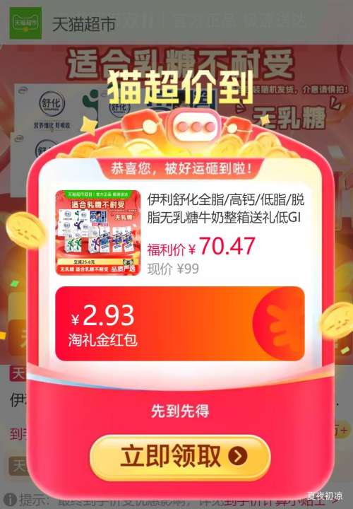 天猫超市88VIP:舒化 零乳糖 笑脸包 纯牛奶 好吸收 脱脂 24盒 220ml