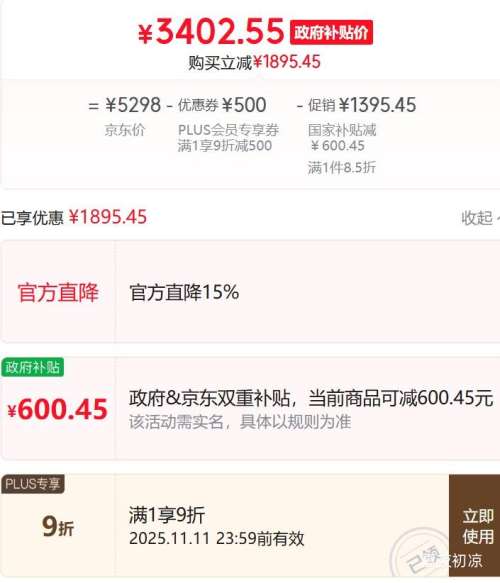 商品到手价3402.55元,根据小编提供的优惠信息(plus超级补贴 限时加码9折券 至高抵(150/500 )+家装厨卫适老化-国补至高30%+9.9元买家居卡499-40),下单1件。好价不错过,感兴趣的朋友可以试试!
