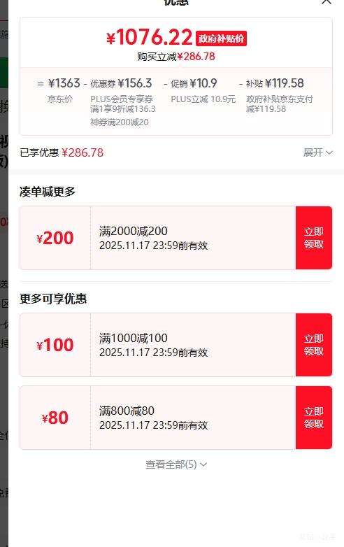 商品到手价1076.22元(需领券),根据小编提供的优惠信息(满1000减100+plus超级补贴 限时加码9折券 至高抵(150/500 )+京东 双11超级惊喜红包 200-20*6张+家装厨卫适老化-国补至高30%),下单1件。好价不错过,感兴趣的朋友可以试试!