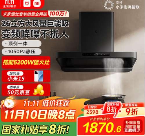 京东自营米家小米变频欧式顶吸油烟机S10 26大吸力静音抽油烟机烟灶以旧换新5.2kW天然气燃气灶【套装商品】