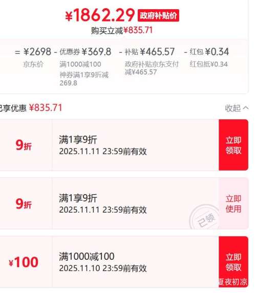 商品到手价1847.29元(晒单返15元京豆后),根据小编提供的优惠信息(满1元,打9折+家电-政府补贴15%/20%-部分地区可领),下单1件。好价不错过,感兴趣的朋友可以试试!