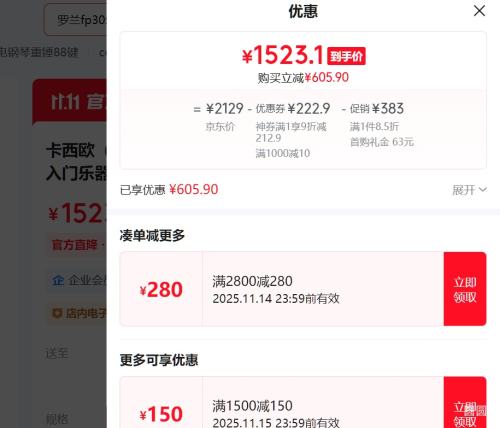 商品到手价1523.1元,根据小编提供的优惠信息(满1000减10+满1元,打9折+慢津贴4.57元),下单1件。好价不错过,感兴趣的朋友可以试试!