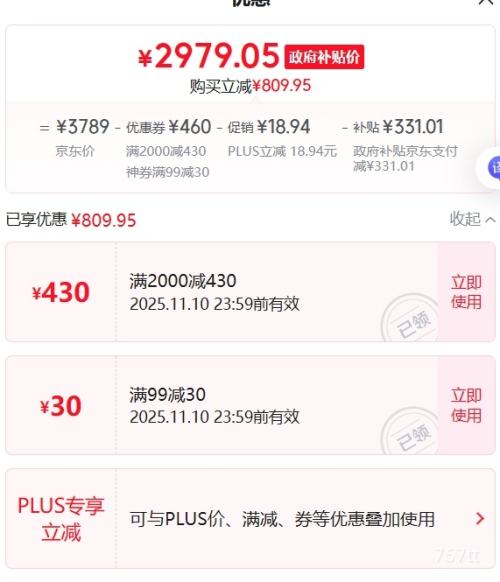 商品到手价2979.05元(需领券,若有首购礼金,晒单返现价更低),根据小编提供的优惠信息(满2000减430+3C-政府补贴15%/20%--部分地区可领),下单1件。好价不错过,感兴趣的朋友可以试试!