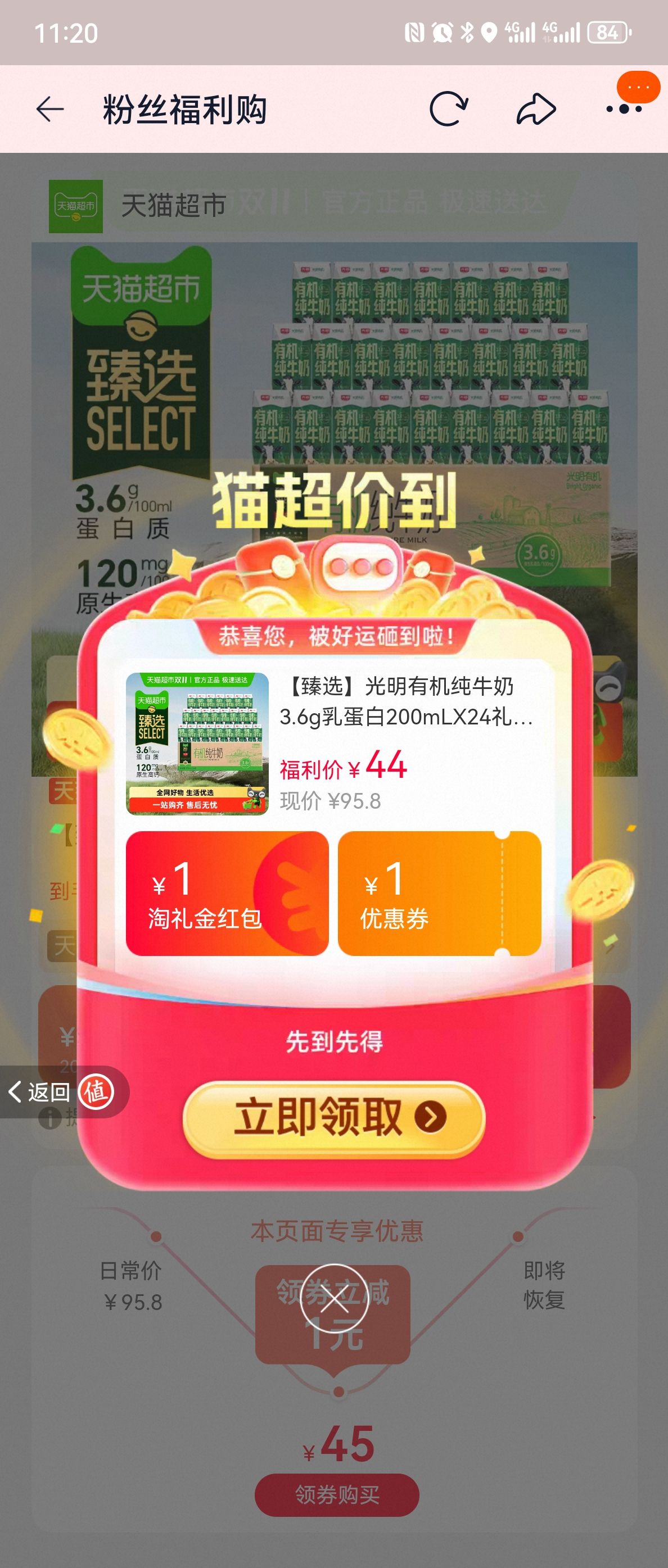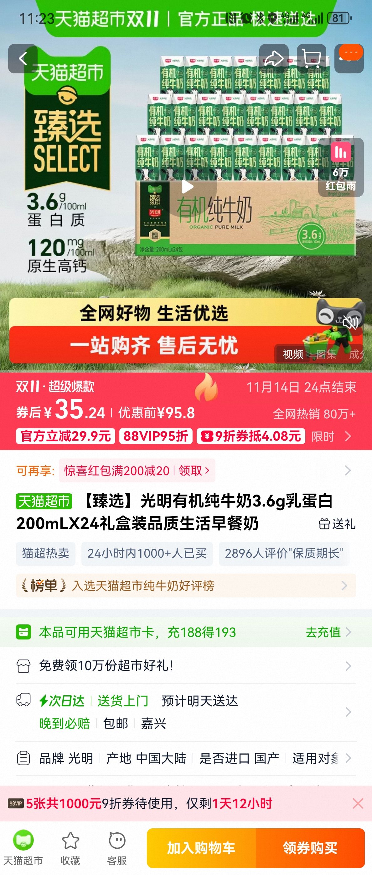 天猫超市闭眼买、再降价:光明 有机纯牛奶 3.6g乳蛋白 200mL×24盒 礼盒装