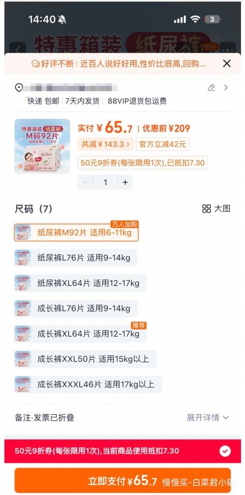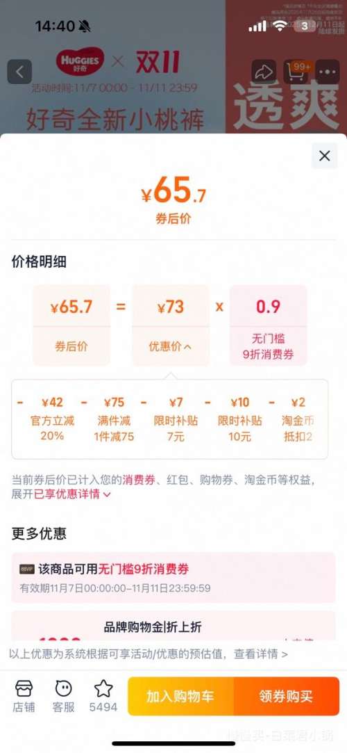 商品到手价65.7元包邮+200淘金币(需用券),根据小编提供的优惠信息(优惠券+88vip双11无门槛9折 开门红消费券 至高抵(50/200/500)),下单1件。好价不错过,感兴趣的朋友可以试试!