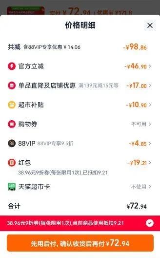 商品到手价64.4元+10.15元淘金币(需领券、需首购),根据小编提供的优惠信息(优惠券+满100减10+88vip双11无门槛9折 开门红消费券 至高抵(50/200/500)),下单1件。好价不错过,感兴趣的朋友可以试试!