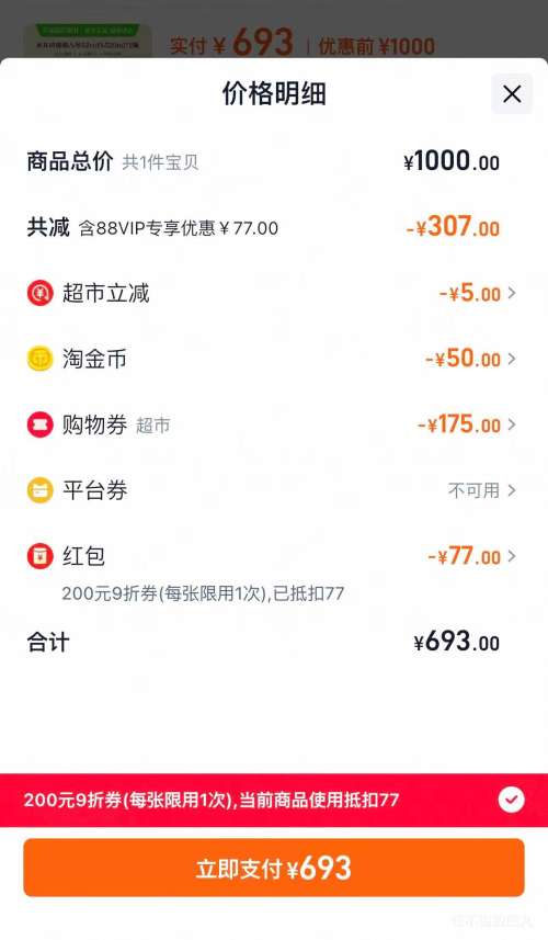 商品到手价693元(需领券)+淘金币50元,根据小编提供的优惠信息(优惠券+满999减175+淘金币抵扣50+88vip双11无门槛9折 开门红消费券 至高抵(50/200/500)),下单1件。好价不错过,感兴趣的朋友可以试试!