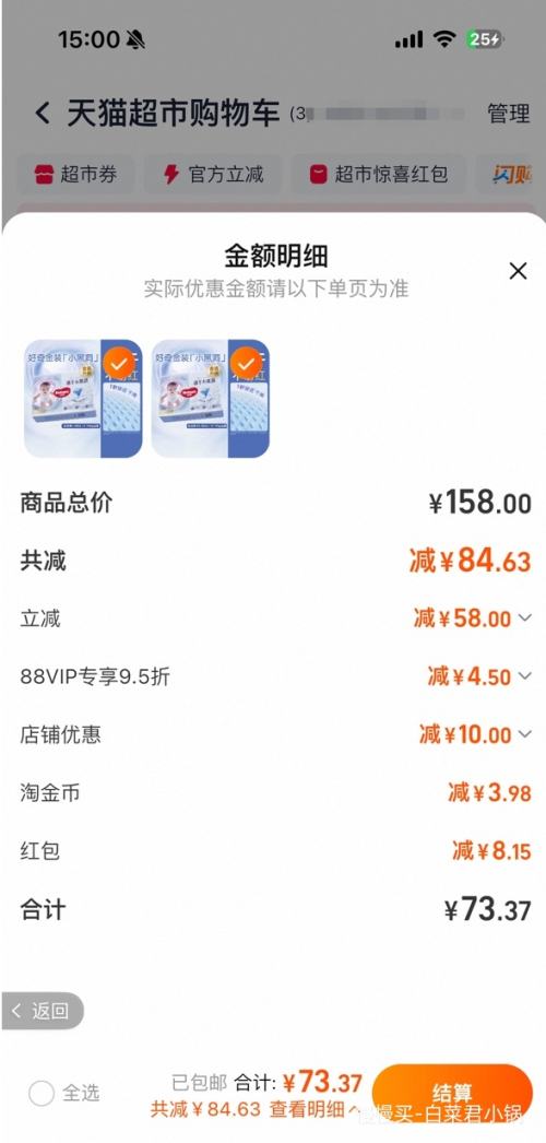 商品到手价合36.69元/件,73.37元包邮+398淘金币(需领券),根据小编提供的优惠信息(优惠券+满99减10券+88vip双11无门槛9折 开门红消费券 至高抵(50/200/500)+慢津贴1元),下单2件。好价不错过,感兴趣的朋友可以试试!