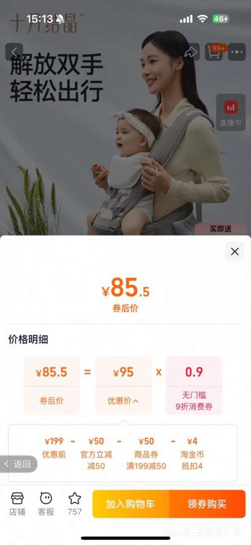 商品到手价85.5元包邮+400淘金币(需领券),根据小编提供的优惠信息(优惠券+满199减50+88vip双11无门槛9折 开门红消费券 至高抵(50/200/500)+慢津贴1.5元),下单1件。好价不错过,感兴趣的朋友可以试试!