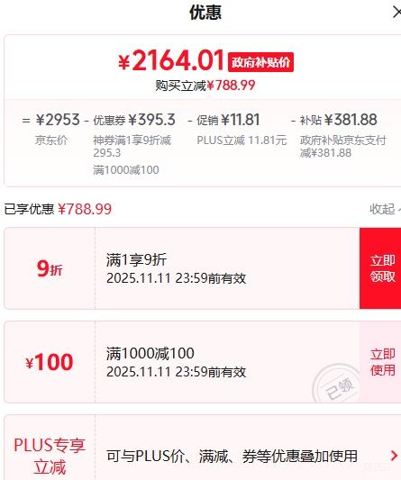 商品到手价2164.01元(需领券),根据小编提供的优惠信息(满1元,打9折+满1000减100元券(搜添可)+家电-政府补贴15%/20%-部分地区可领),下单1件。好价不错过,感兴趣的朋友可以试试!