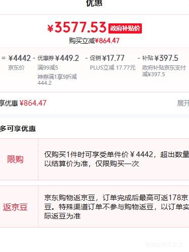 商品到手价3577.53元(需领券),根据小编提供的优惠信息(满1元,打9折+家电-政府补贴15%/20%-部分地区可领),下单1件。好价不错过,感兴趣的朋友可以试试!
