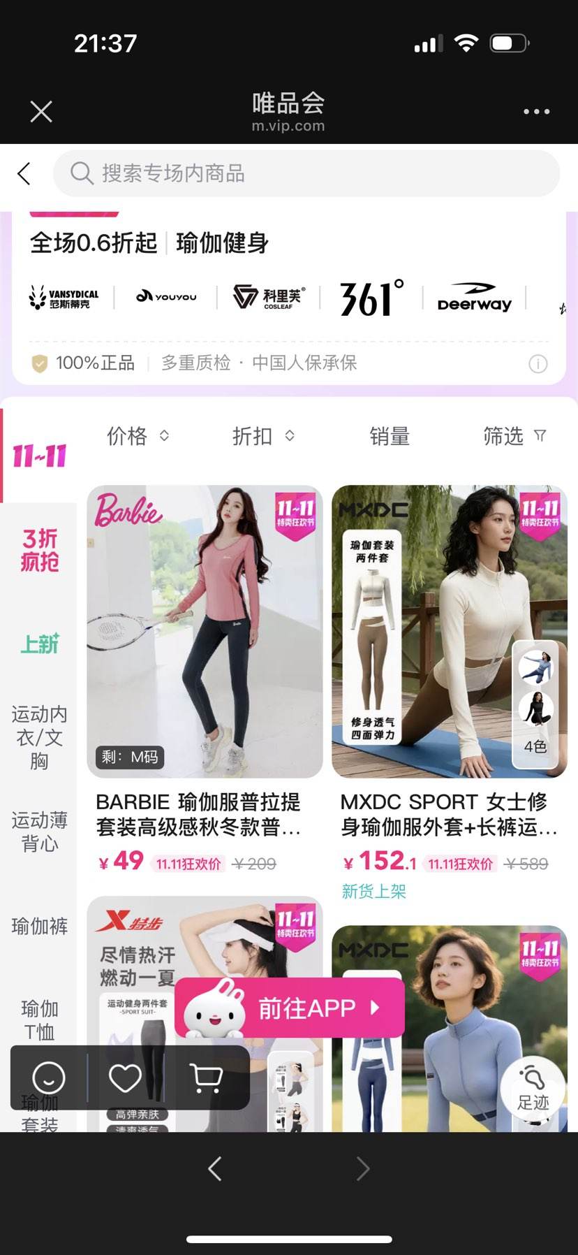 唯品会瑜伽装备0.6折起!49元抢Barbie套装