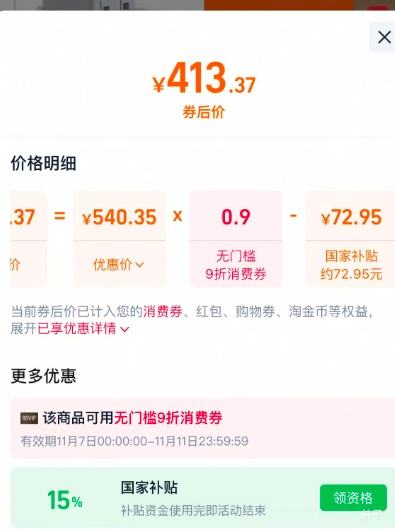 商品到手价413.37元(需领券),根据小编提供的优惠信息(优惠券+88vip双11无门槛9折 开门红消费券 至高抵(50/200/500)+家装家纺-政府补贴15%/20%--部分地区可领),下单1件。好价不错过,感兴趣的朋友可以试试!