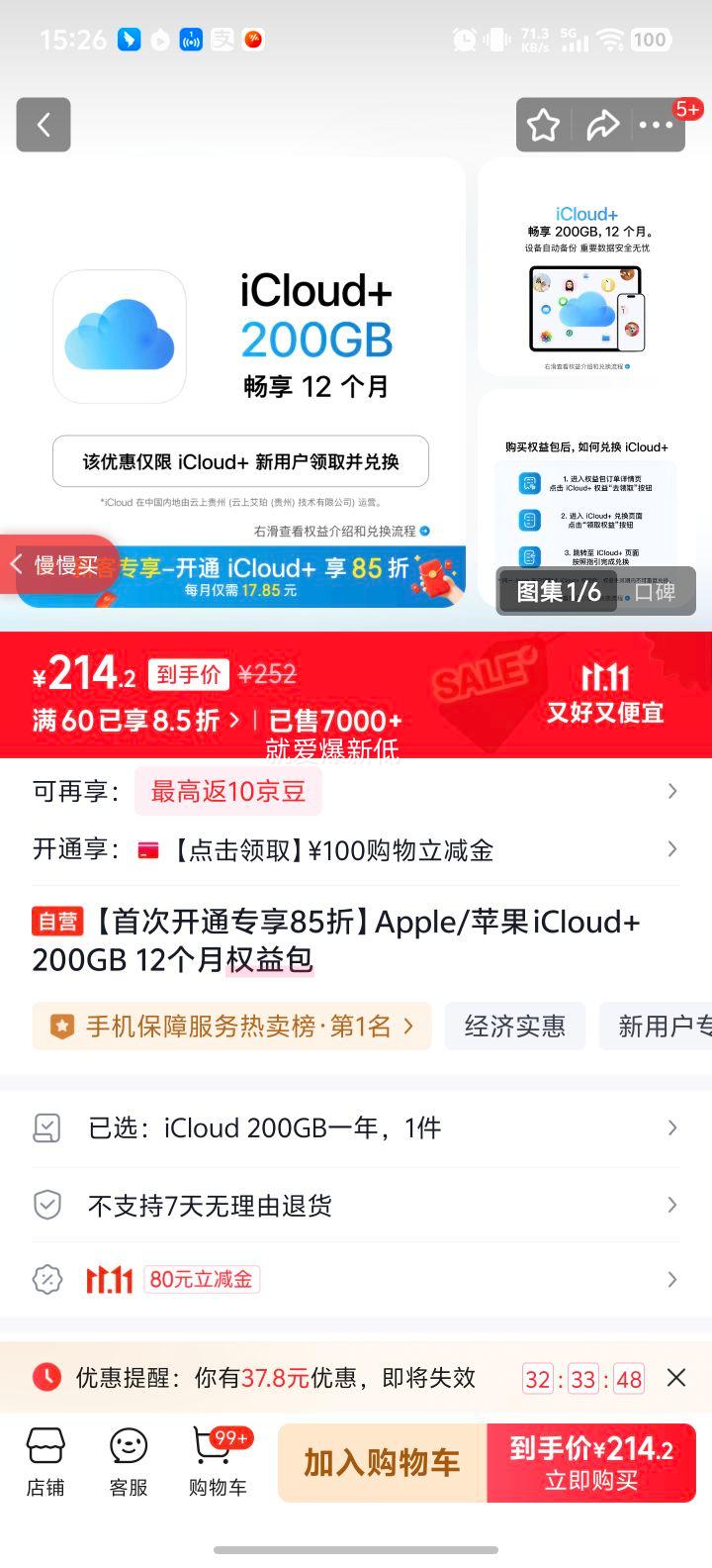 京东自营【首次开通专享85折】Apple/苹果 iCloud+ 200GB 12个月权益包