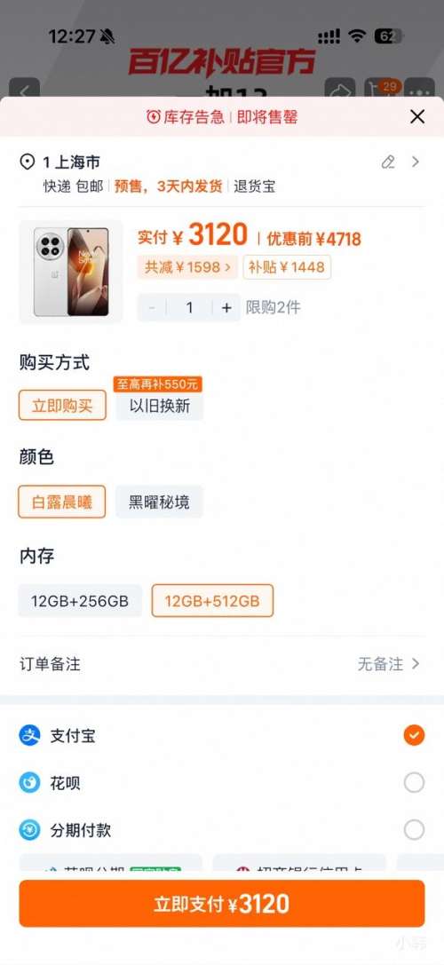 商品到手价3120元(非国补),根据小编提供的优惠信息(优惠券+百亿补贴金刚券-9折/8折),下单1件。好价不错过,感兴趣的朋友可以试试!