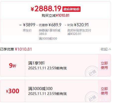 商品到手价2888.19元(需领券),根据小编提供的优惠信息(满1元,打9.9折+满1元,打9折+3000-300券,会跳到12+256款+手机国补-沪鄂粤湘云川黑琼陕晋蒙厦门立减15%(至高500)),下单1件。好价不错过,感兴趣的朋友可以试试!