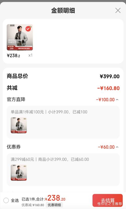 商品到手价238.2元(需领券),根据小编提供的优惠信息(满299减60),下单1件。好价不错过,感兴趣的朋友可以试试!