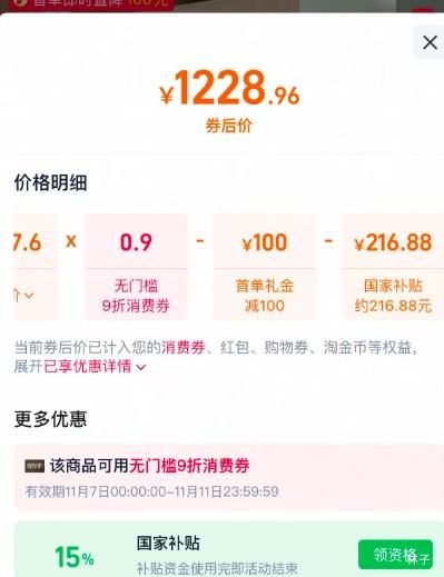 商品到手价1228.96元(需领券、需首购),根据小编提供的优惠信息(优惠券+88vip双11无门槛9折 开门红消费券 至高抵(50/200/500)+家装家纺-政府补贴15%/20%--部分地区可领),下单1件。好价不错过,感兴趣的朋友可以试试!