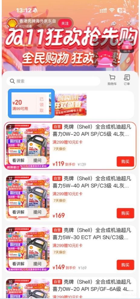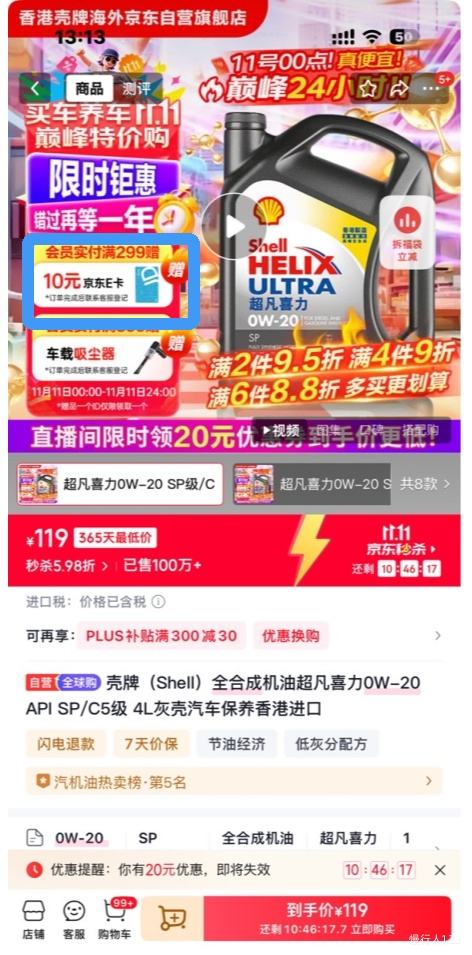 京东自营再降价:壳牌(Shell)全合成机油超凡喜力0W-20 API SP/C5级 4L 灰壳汽车保养香港进口