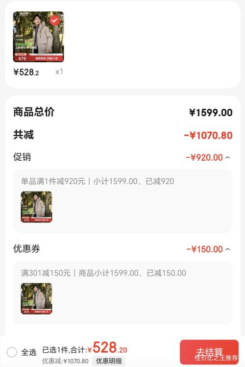 商品到手价528.2元(需领券),根据小编提供的优惠信息(满301减150(限平台)+满461减230),下单1件。好价不错过,感兴趣的朋友可以试试!