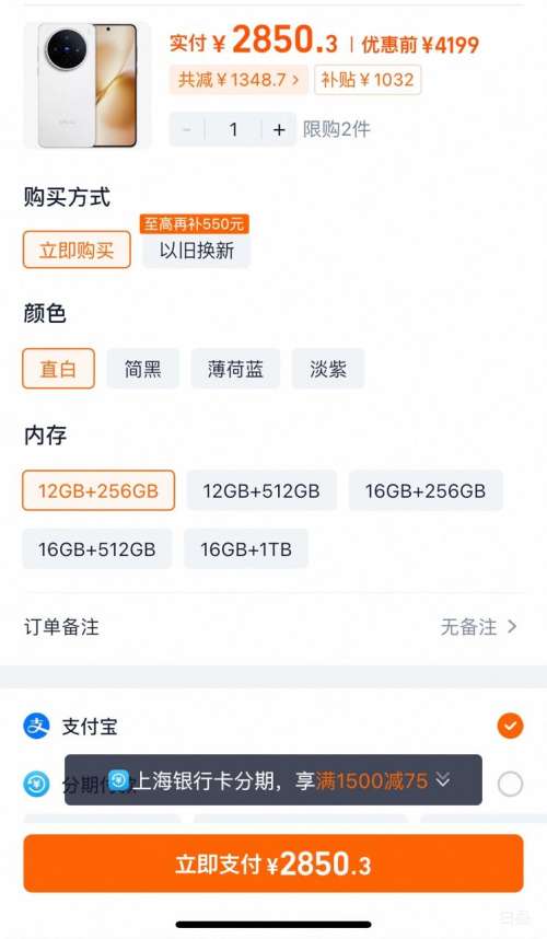 商品到手价2850.3元(不用国补),根据小编提供的优惠信息(优惠券+百亿补贴金刚券-9折/8折+慢津贴1元),下单1件。好价不错过,感兴趣的朋友可以试试!