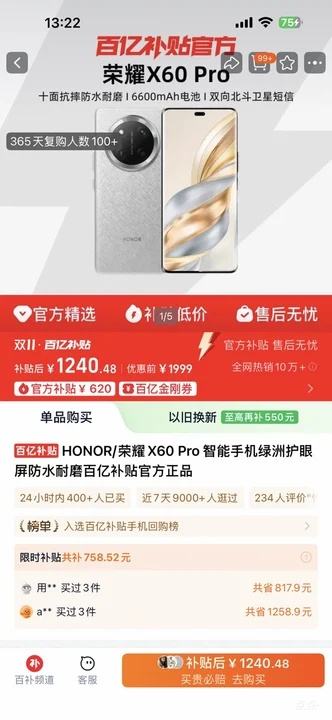 商品到手价1241.1元(无需国补),根据小编提供的优惠信息(优惠券+百亿补贴金刚券-9折/8折),下单1件。好价不错过,感兴趣的朋友可以试试!